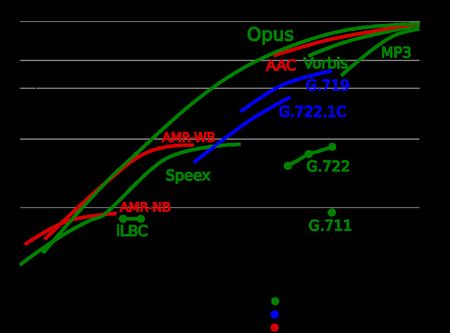 Quality vs. bitrate comparison of various codecs. Opus (green) consistently achieves higher quality (MOS) at a given bitrate compared to older codecs like Speex, AMR, G.722, MP3, AAC, etc. Notably, Opus in wideband mode outperforms AMR-WB, and at low bitrates Opus far exceeds codecs like AMR-NB or iLBC.
