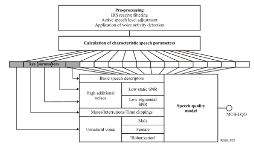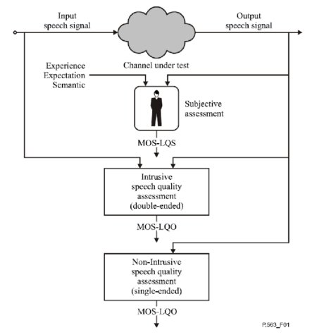 ITU-T P.563 is a recommendation for single-ended voice quality estimation (often called 3SQM – Single Sided Speech Quality Measure). The idea is to take a recording of a call (just what one person heard) and predict what the MOS would be without needing the reference. P.563 does this by extracting features from the audio: detecting if there's background noise, how much speech is clipped or distorted, etc., and uses an internal model to guess the quality.