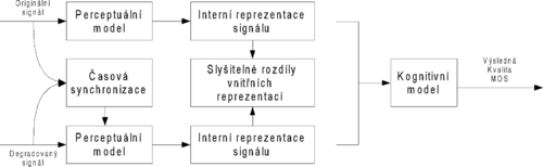 PESQ perceptual model architecture showing signal flow from original and degraded signals through perceptual models to MOS output