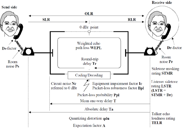 E-model reference connection showing all impairment parameters including SLR, RLR, TELR, delay, noise, and codec factors