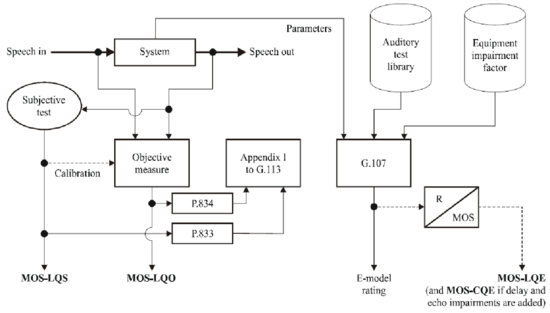 Voice quality measurement methodology overview showing subjective testing, objective measures (P.834, P.833), and E-model (G.107) approaches