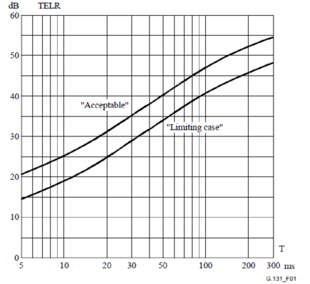 TELR tolerance limits as a function of round-trip delay (ITU-T G.131). The "Acceptable" and "Limiting case" curves show that as delay increases, higher TELR (more echo attenuation) is required.